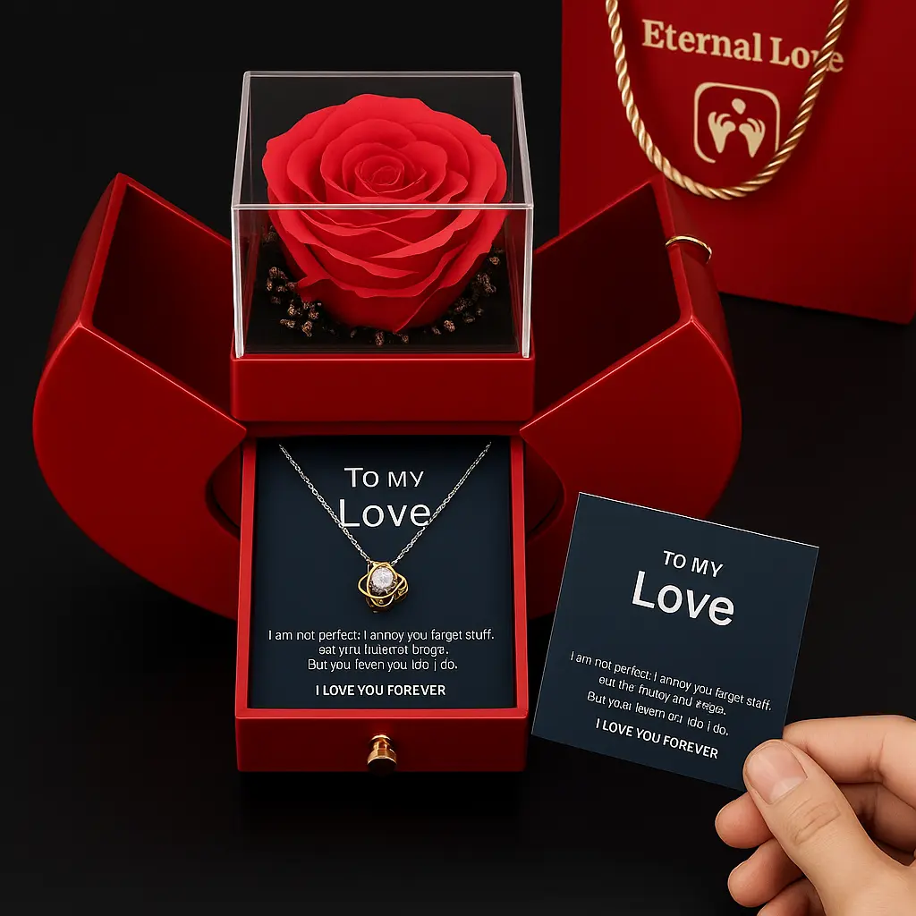 Each gift set includes a beautifully preserved rose, a premium white gold or silver necklace, elegant packaging, and an optional greeting card — everything you need to create a magical, tear-jerking moment.